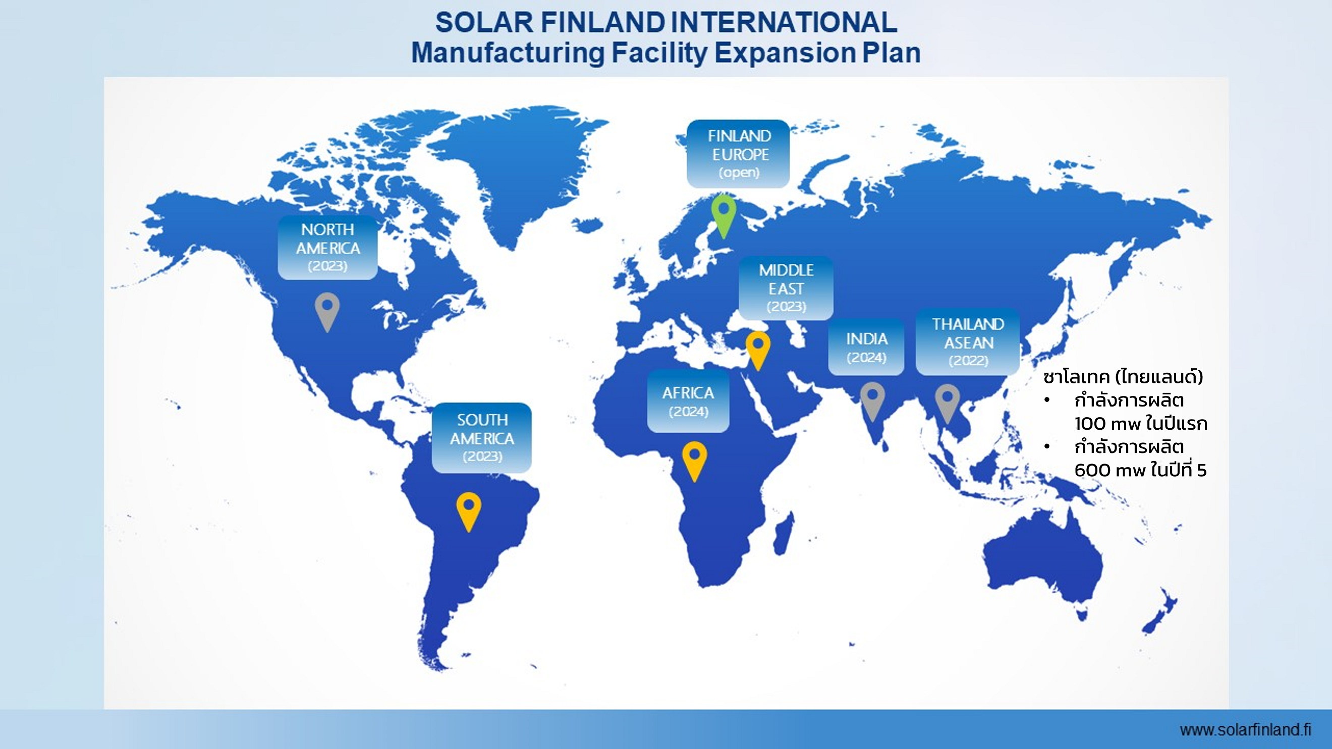 แผง SALO® ที่มีจำหน่ายในประเทศไทยผลิตที่โรงงาน Salo Tech (Thailand) จังหวัดระยอง บริษัท ซาโล เทค (ไทยแลนด์) จำกัด เป็นการร่วมทุนระหว่าง บริษัท Solar Finland เจ้าของเทคโนโลยี, Finnish Fund for Industrial Cooperation (FINNFUND) กองทุนเพื่อการพัฒนาของรัฐบาลฟินแลนด์, และ PEA ENCOM International บริษัทในเครือการไฟฟ้าส่วนภูมิภาค (PEA) เป็นครั้งแรกที่รัฐวิสาหกิจของไทยและฟินแลนด์ลงทุนร่วมกัน SALO® Solar Panel ถูกผลิตด้วยสายการผลิตระบบอัตโนมัติ Salo Automation® ที่ออกแบบและสร้างขึ้นในประเทศฟินแลนด์ ผลิตภายใต้การควบคุมคุณภาพที่เข้มงวดมาตรฐานยุโรป แต่ใช้วัตถุดิบในประเทศเป็นหลักและจ้างพนักงานชาวไทย ดังนั้นการซื้อแผงของเราจึงหมายถึงการสนับสนุนเศรษฐกิจท้องถิ่นในประเทศ และเนื่องจากผู้ถือหุ้นทุกรายเป็นองค์กรระหว่างประเทศขนาดใหญ่ โรงงานตั้งอยู่ในประเทศไทย ผู้บริโภคจึงมั่นใจได้ในคุณภาพสินค้าและเชื่อถือได้เรื่องการรับประกัน
