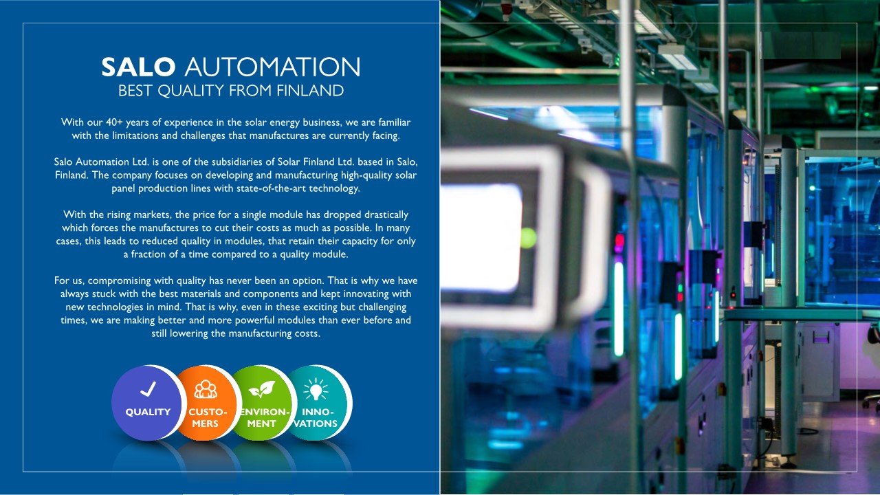 SALO® panels available in Thailand are manufactured at the Salo Tech (Thailand) factory in Rayong Province. Salo Tech (Thailand) Co., Ltd. is a joint venture between Solar Finland (the technology owner), the Finnish Fund for Industrial Cooperation (FINNFUND): a development fund under the Finnish government, and PEA ENCOM International: a subsidiary of the Provincial Electricity Authority (PEA). This marks the first-ever joint investment between Thai and Finnish state enterprises. SALO® Solar Panels are produced using the Salo Automation® production line, which was designed and built in Finland. While production is held to strict European quality control standards, the factory primarily utilizes local raw materials and employs a Thai workforce. Purchasing our panels directly contributes to Thailand's domestic economic growth. Since all shareholders are major international organizations and the factory is physically located in Thailand, consumers can have full confidence in both product quality and the reliability of our long-term warranties.