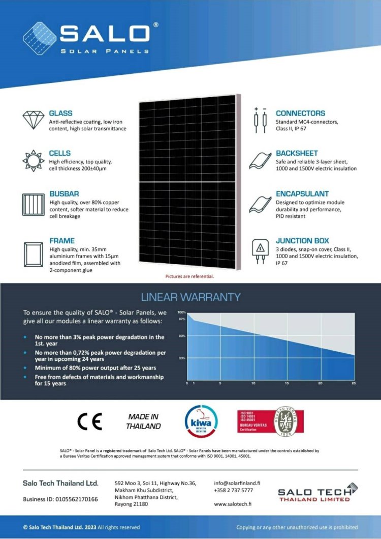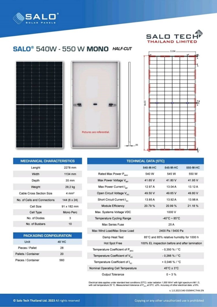ค่าต่างๆที่ใช้อ้างอิงมาจากการทดสอบแผงที่ผลิตจริงโดยเครื่องจักรระบบอัตโนมัติ Salo Automation® ที่ติดตั้งอยู่ที่ บริษัท ซาโลเทค (ไทยแลนด์) จำกัด และเป็นสเปคที่ทางโรงงานคอนเฟิร์มว่าใช้ผลิตเพื่อจำหน่ายจริง ทำให้ บริษัท ฟินโนล่าร์ (ไทยแลนด์) จำกัด จะมีแผงสำหรับจำหน่ายและติดตั้ง 2 ขนาดมาตรฐานคือ SALO® 440W MONO HALF-CUT และ SALO® 540W-550W MONO HALF-CUT ส่วนแผงขนาดพิเศษที่นอกเหนือจากขนาดมาตรฐานให้ผู้ที่สนใจติดต่อสอบถามกับทางบริษัทฟินโนล่าร์ (ไทยแลนด์) เป็นกรณีพิเศษ จึงเรียนมาเพื่อให้ผู้สนใจทุกท่านทราบ