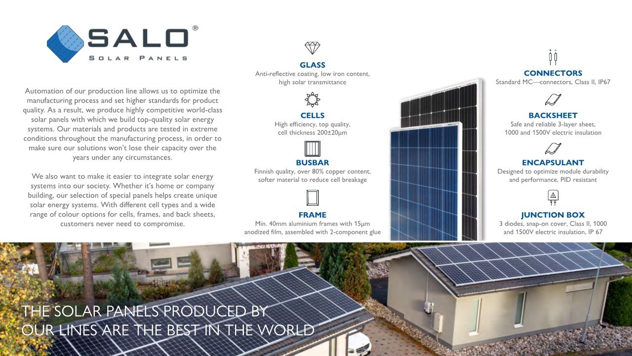 บริษัท ฟินโนล่าร์ (ไทยแลนด์) จำกัด มีความยินดีจะแจ้งให้ทราบว่าแผง SALO® รุ่นใหม่ที่จะมีจำหน่ายและให้บริการติดตั้งเป็นแผงขนาด 540W-550W เป็นแผงที่ผลิตในประเทศไทยที่โรงงานซาโลเทค (ไทยแลนด์) จังหวัดระยอง มีบริษัทฟินโนล่าร์ (ไทยแลนด์) เป็นตัวแทนจำหน่ายและติดตั้งระบบอย่างเป็นทางการ โดยแผงรุ่นใหม่นี้จะมาทดแทนแผง SALO® 520W MONO HALF-CUT ที่บริษัทเคยให้ข้อมูลผ่านสื่อต่างๆไปก่อนหน้านี้ ข้อดีของแผงรุ่นใหม่มีดังนี้